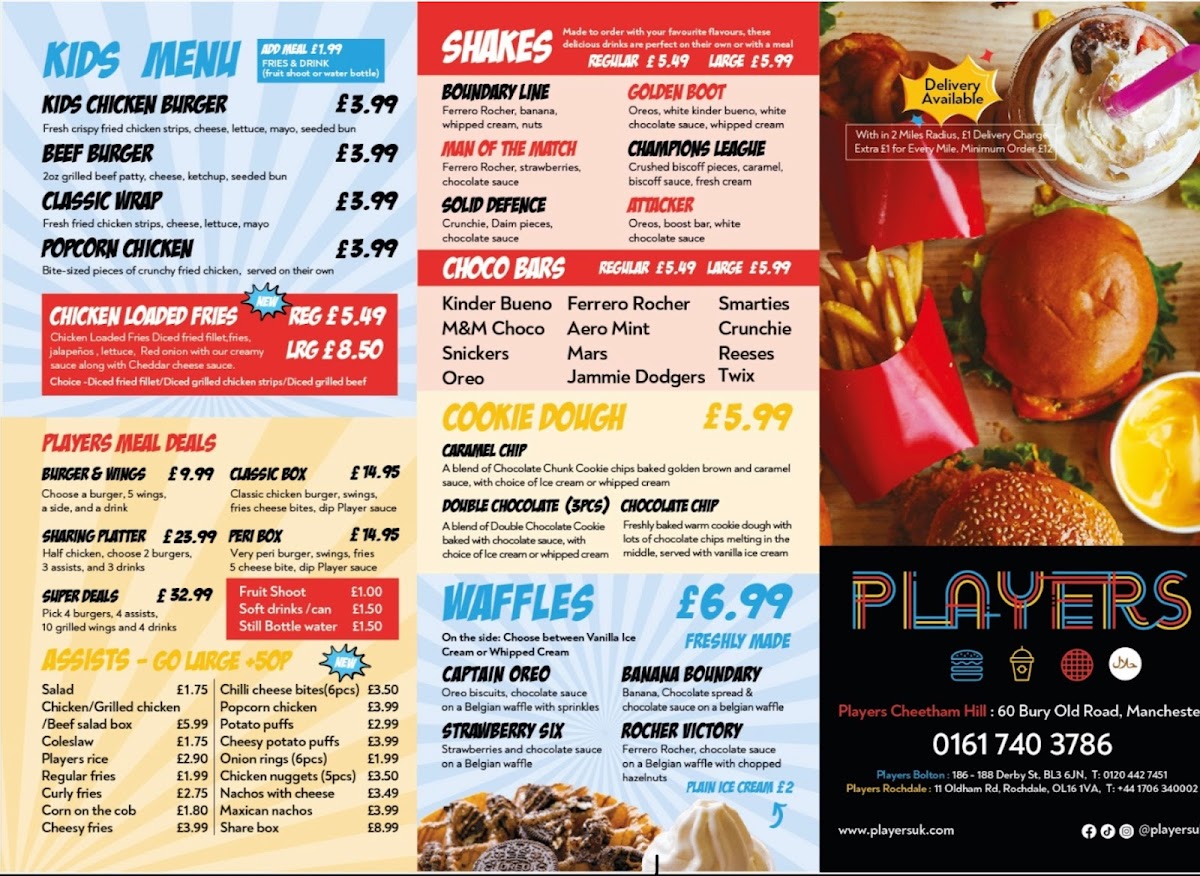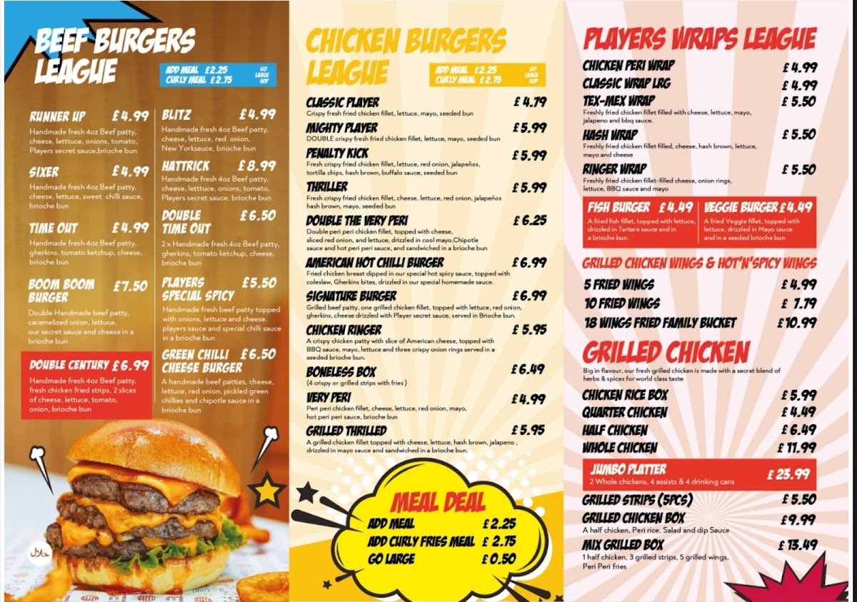 Welcome to Players Bolton, a gem located at 186-188 Derby St, Bolton BL3 6JN. This culinary hotspot will delight your taste buds with its mouthwatering offerings. Their menu showcases an impressive Beef Burgers League, with standouts like the Time Out Cheeseburger – a hand-made grilled beef patty layered with gherkins, cheese, and tangy tomato ketchup, all nestled in a fluffy brioche bun for just £5.99. For those craving a hearty delight, the Double Time Out Cheeseburger promises double the flavor!